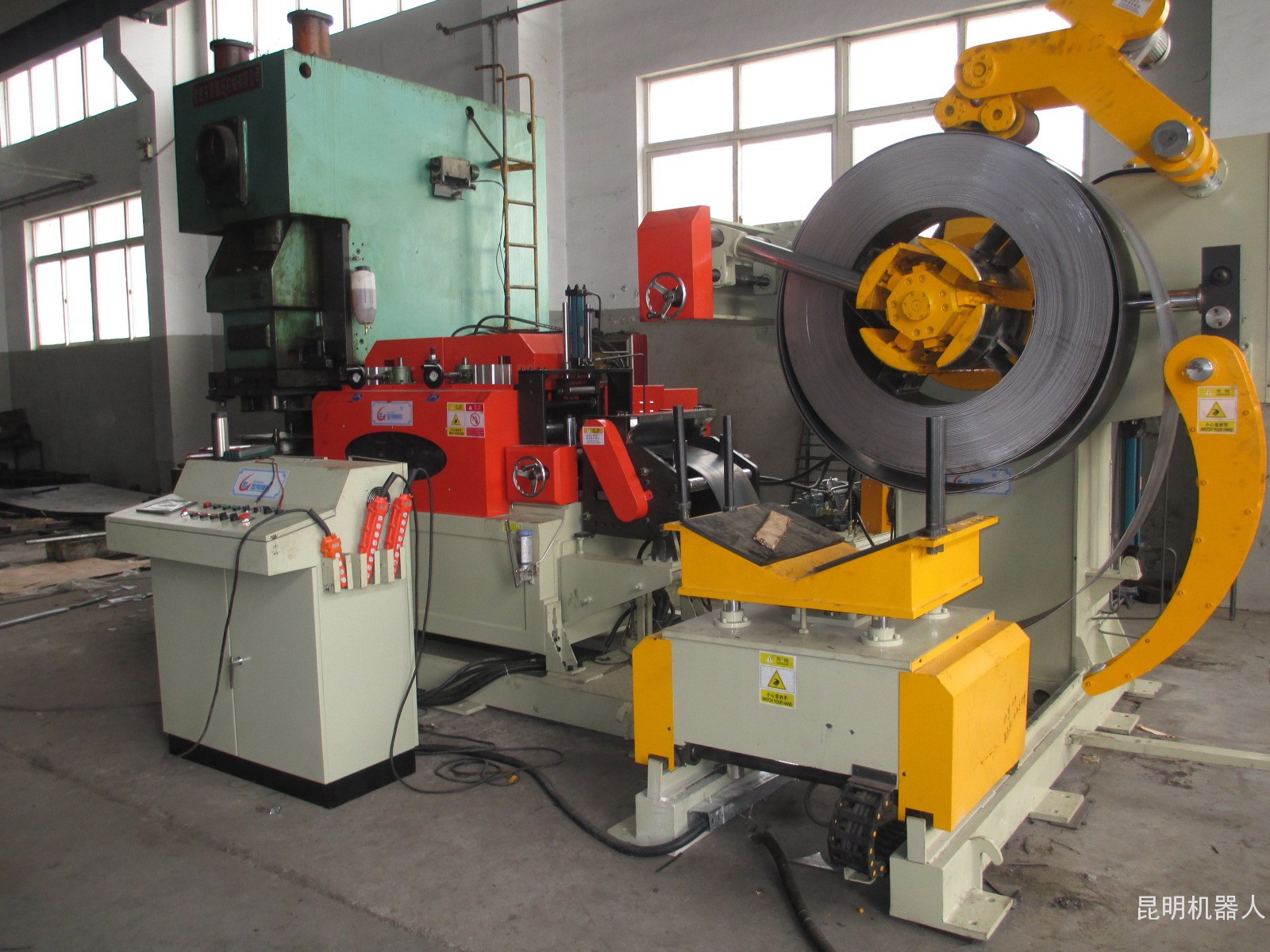 組成:上料小車、開卷機(jī)、拆卷引料機(jī)、校平機(jī)、活套、定尺裝置、剪床、輸送機(jī)、垛板系統(tǒng);