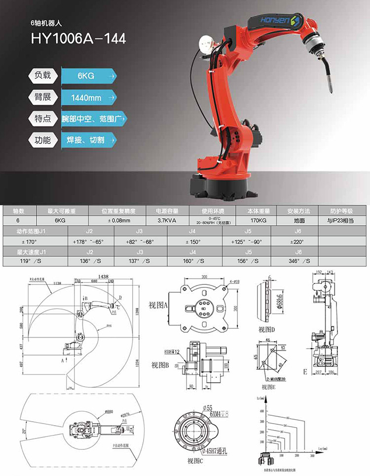 標(biāo)準(zhǔn)工業(yè)機(jī)器人本體分為1.4米/1.6米/1.8米/2米焊接半徑范圍;